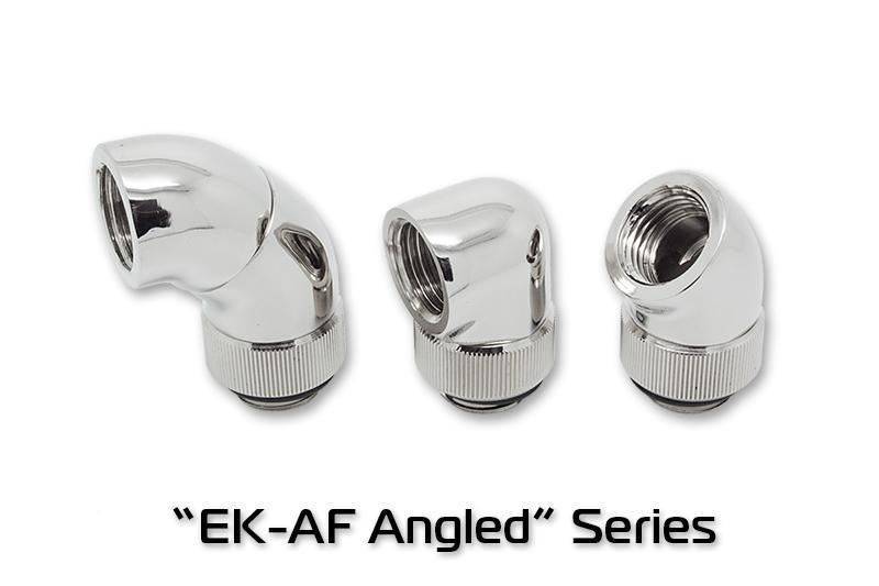 EK - AF Angled 90° G1/4 - Nickel er en fuldt roterbar high flow 90 graders vinkeladapter med gevind. Har universel ¼" BSPP (G1/4) gevind, så du selv kan vælge hvilken fitting du vil bruge!