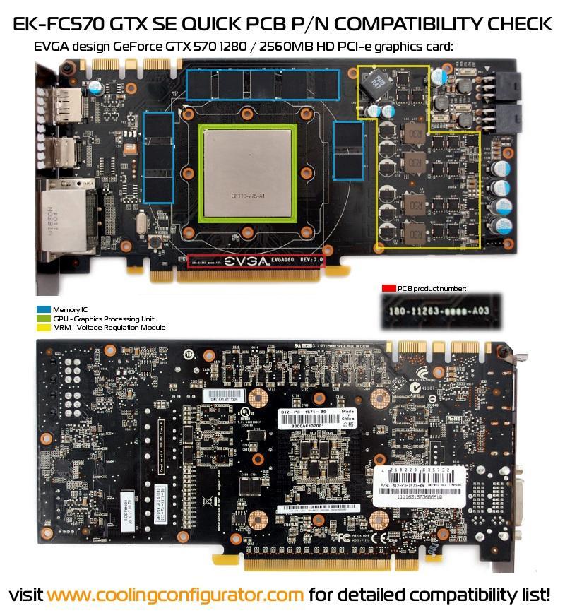 Bemærk: Dette kølehoved passer kun NVIDIA GTX570 grafikkort der følger det nye PCB reference design (NVA-P1263). Tjek derfor om dit kort er kompatibelt i EK's Cooling Configurator.